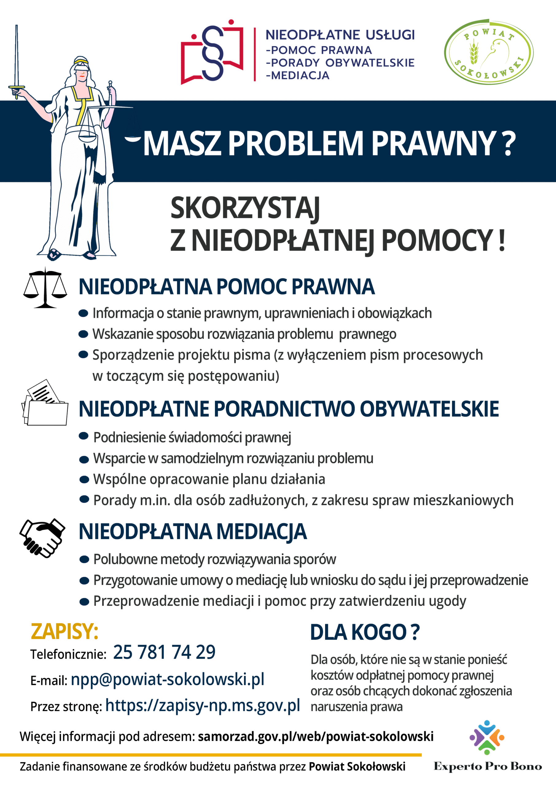 Z przyjemnością informujemy, iż od dnia 1 stycznia 2025 r. Fundacja Rozwoju Świadomości Obywatelskiej Experto Pro Bono z siedzibą w Zamościu prowadzi na terenie powiatu sokołowskiego 1 punkt nieodpłatnej pomocy prawnej oraz nieodpłatnego poradnictwa obywatelskiego.